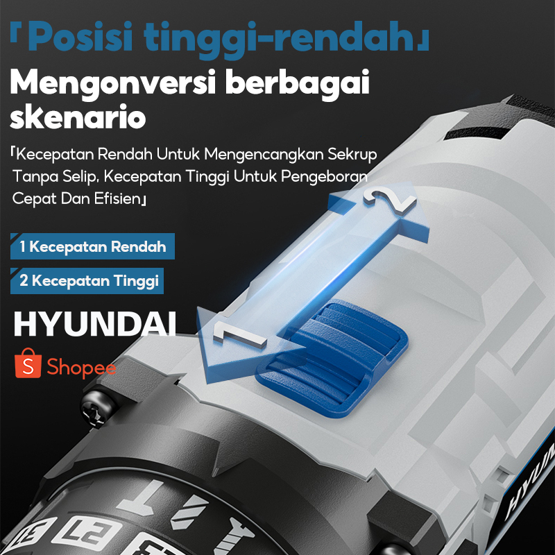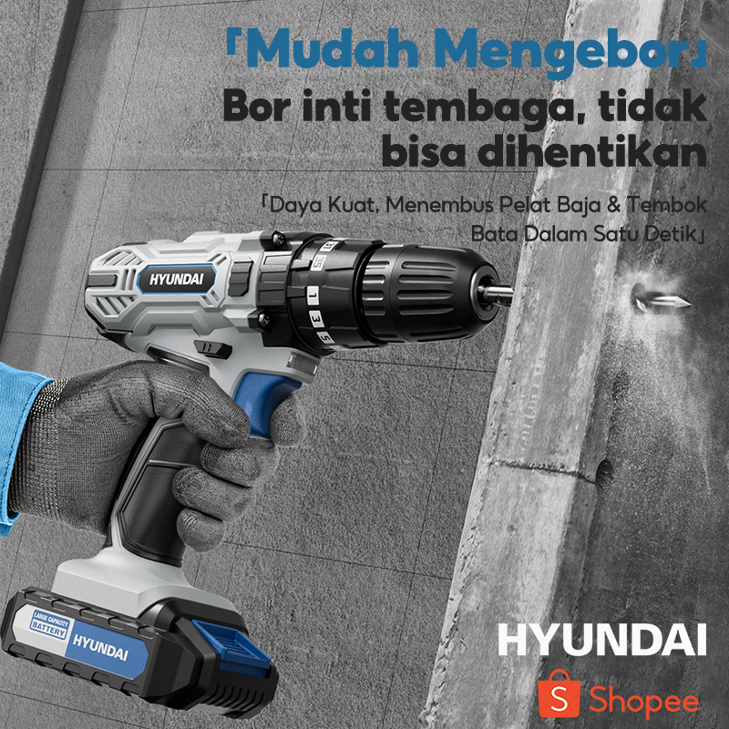 HYUNDAI Mesin Bor Listrik Set Lengkap Baterai Cordless Alat Tukang Tool Kit Tang Obeng Palu Kunci Pas Pita Pengukur