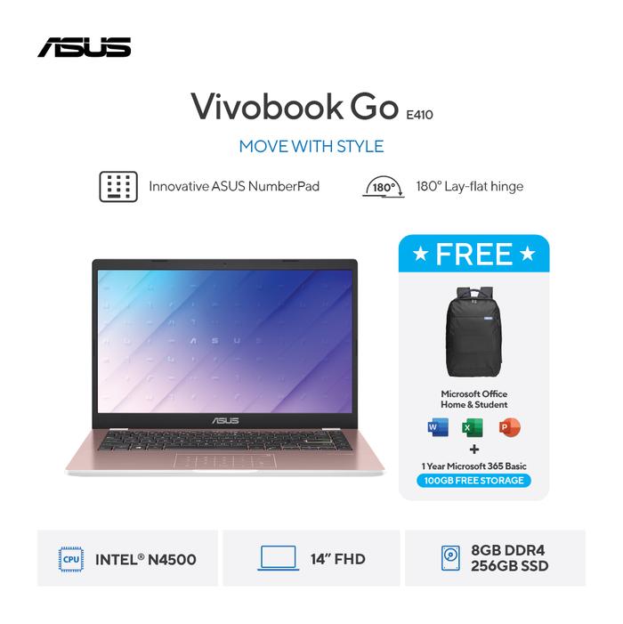 [Free Mouse] Asus Vivobook Go 14 E410Ka-Fhd4822M - Rose Pink [Intel Celeron N4500 / Intel Uhd Graphics / 8Gb / 256Gb / 1