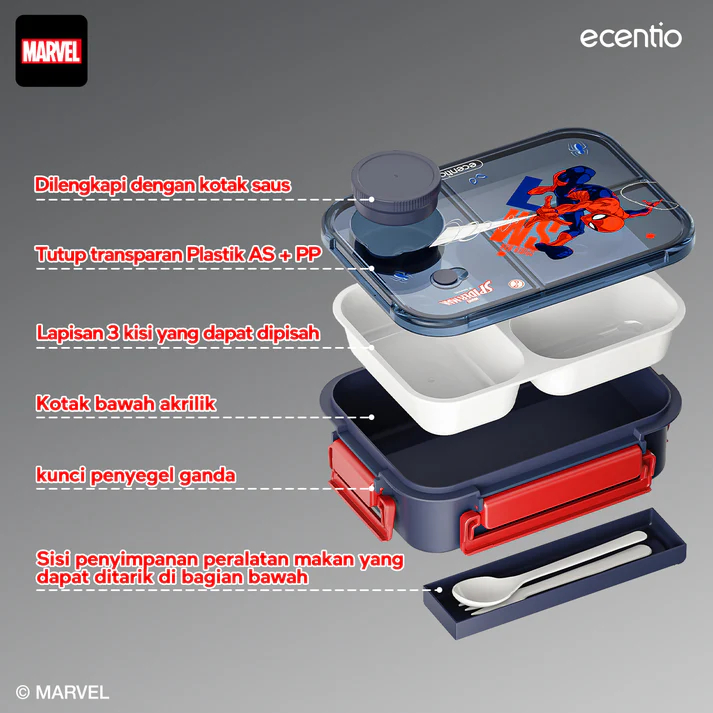 ECENTIO Kotak Makan / Bekal /Lunch Box 3 sekat dan Botol Minum 750 ml Spiderman Anti Tumpah BPA Free