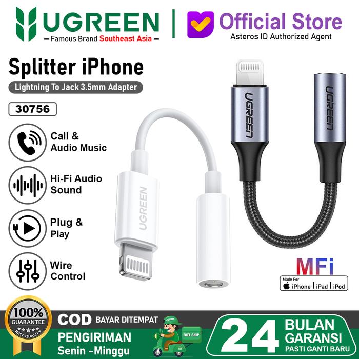 UGREEN Converter Splitter iPhone Mfi Lightning To Jack 3.5Mm Original gray white