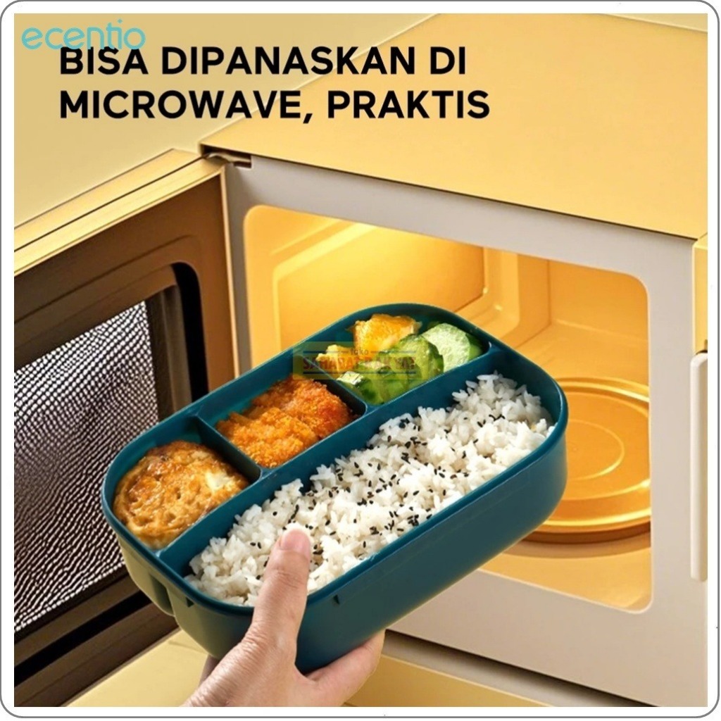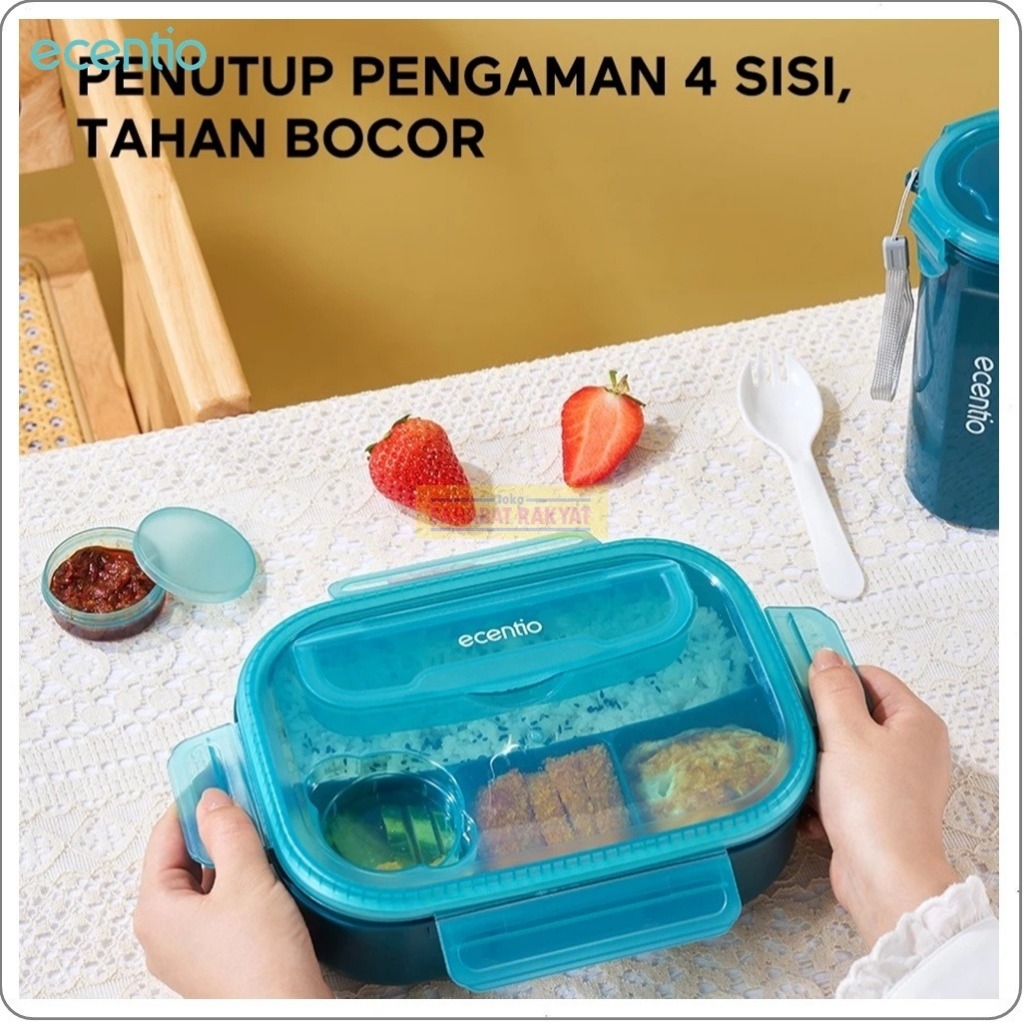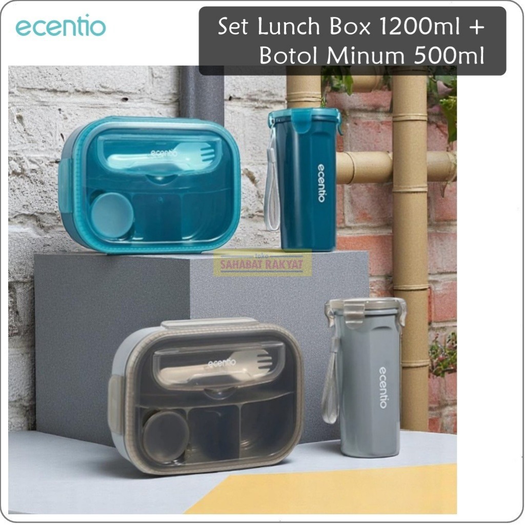 Set Lunch Box 1200ml + Botol Minum 500ml Ecentio. Free Sendok & Kotak Saus. Bebas BPA. PP Food Grade