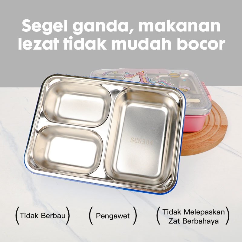 Bilikot Kotak Makan Siang Anak 900ml Lunch Box Stainless Steel Microwaveable 3 Sekat BPA Free