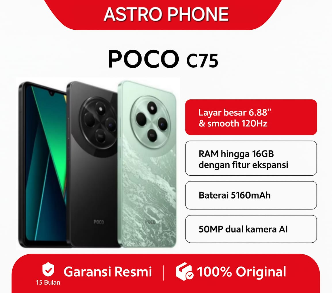 POCO C75 (6/128GB) (8/256GB) Layar 6,88" 50MP AI Refresh rate 120 Hz Baterai 5.160mAh 18W Pengisian cepat
