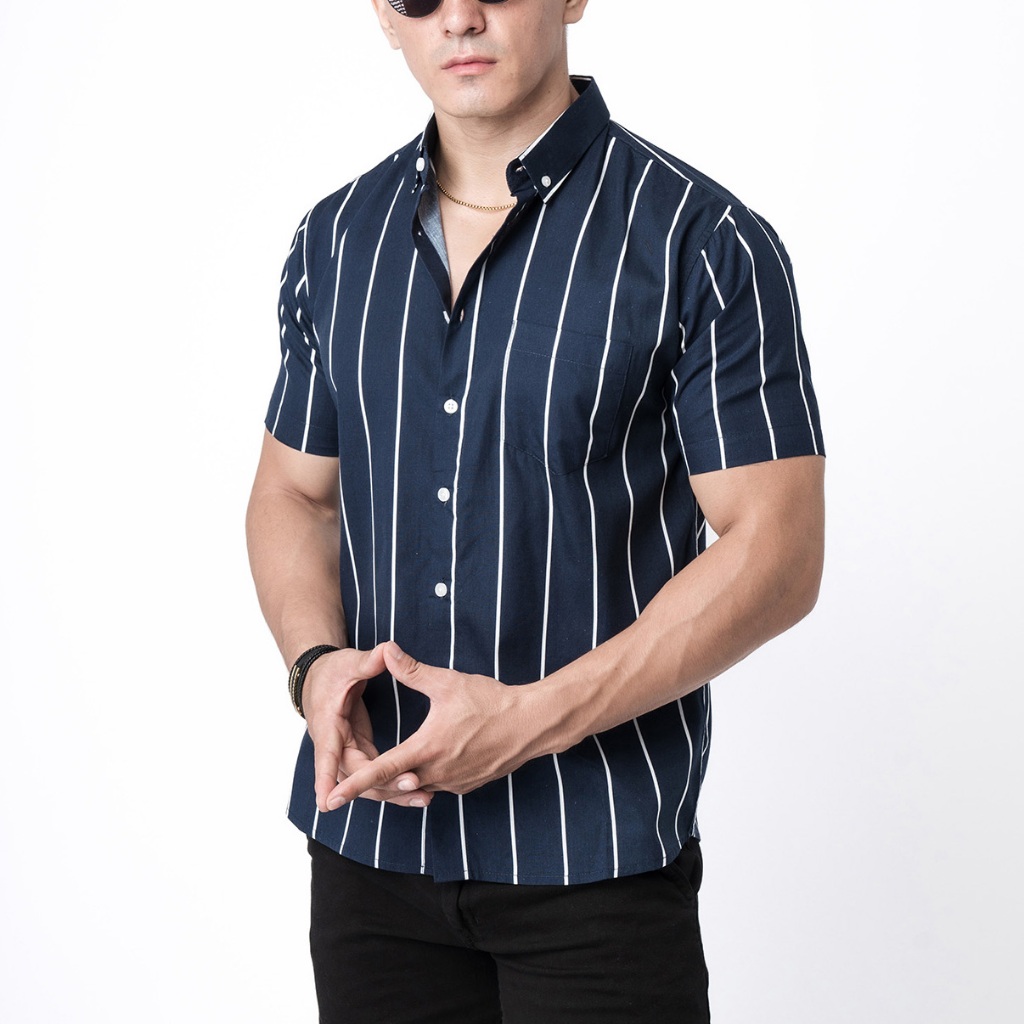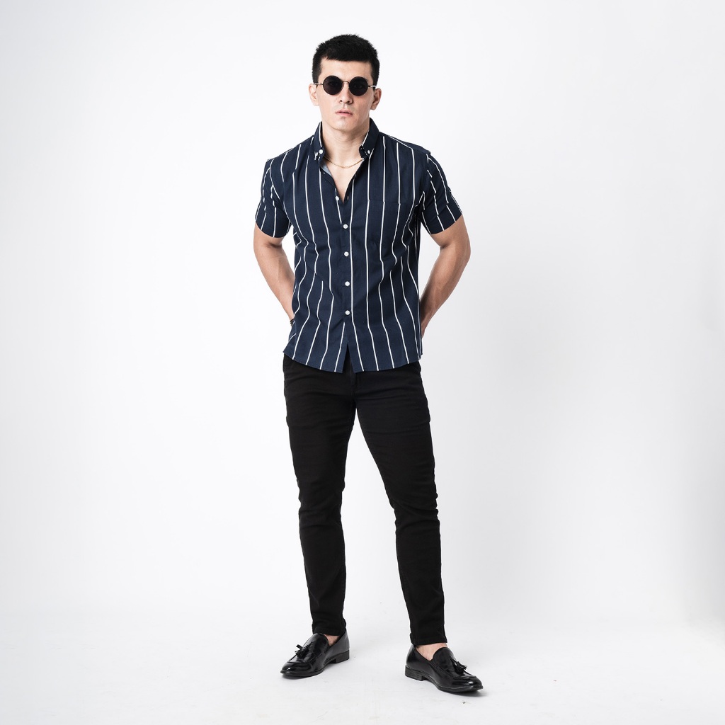 [Mall] VENGOZ Atasan Kemeja Pria Slim Fit - Vicente Stripe Navy SS
