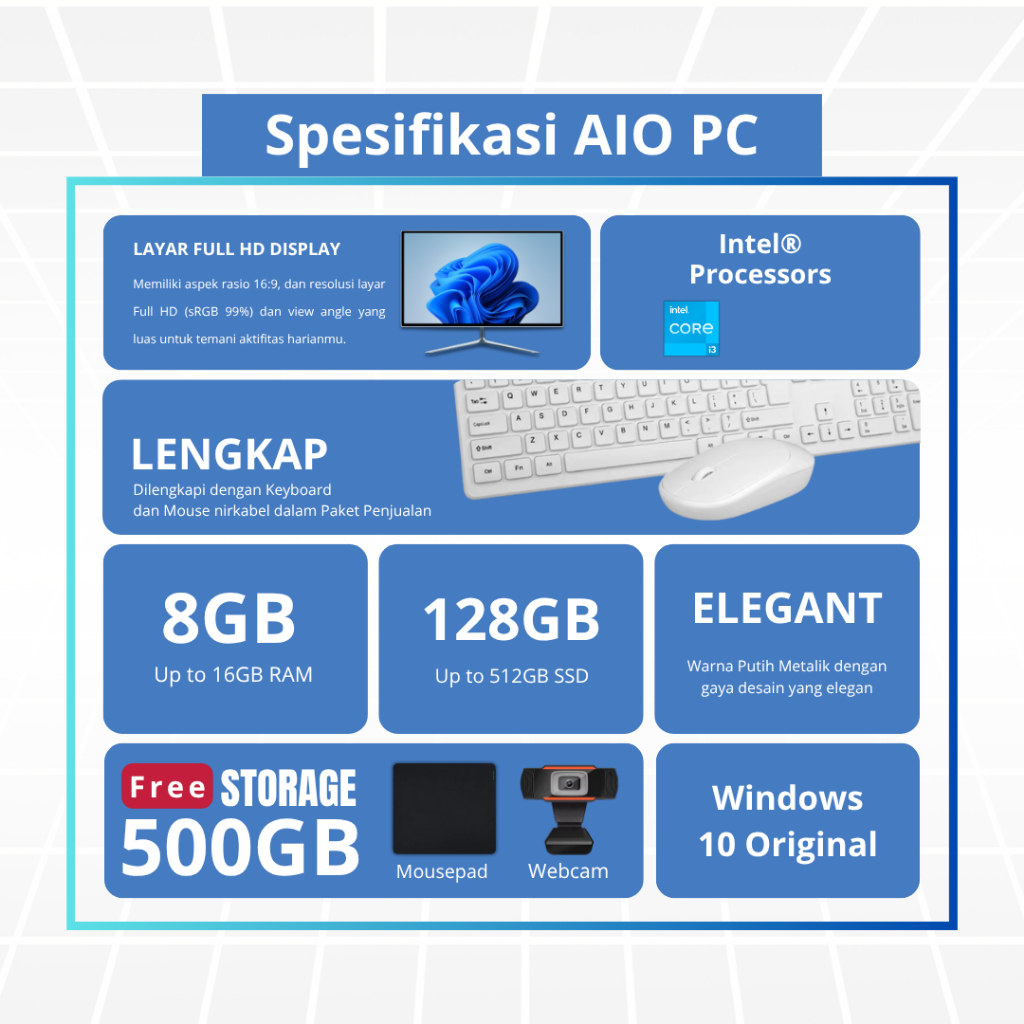 PC AIO OASES ALL IN ONE KOMPUTER INTEL CORE I3 RAM 8GB SSD 128GB/256GB HDD 500GB LAYAR 19/22 INCH WINDOWS 10 – PC DESKTOP MURAH