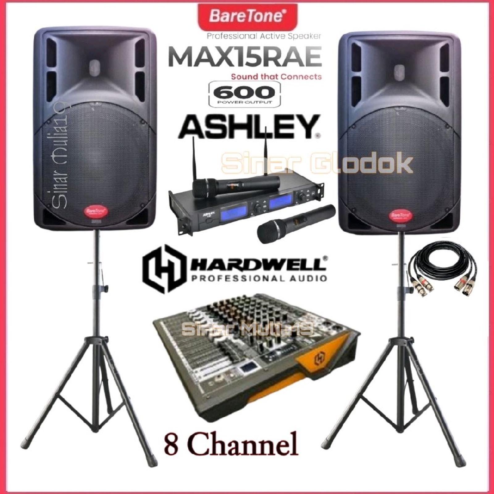 Paket Sound System Speaker Aktif 15 Inch BareTone MAX15RAE Mixer Hardwell 8CH Mic Wireless