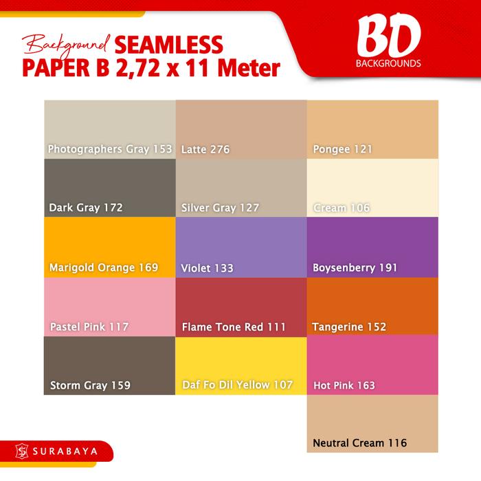 106 Cream (krem), 107 Daf-Fo-Dil Yellow (kuning), 111 Flame Tone Red (merah), 116 Natural Cream, 117 Pastel Pink (merah muda), 121 Pongee (coklat), 127 Silver Gray (abu-abu), 133 Violet (ungu muda), 152 Tangerine (orange), 153 Photographers Gray (abu-abu), 159 Storm Gray (abu-abu), 163 Hot Pink (merah muda), 169 Marigold Orange (oranye), 172 Dark Gray (abu-abu), 191 Boysenberry (ungu), 276 Latte (coklat), BD B, Boysenberry, Cream, DafFoDilYellow, Dark Gray, Flame Tone Red, Hot Pink, Latte, Marigold Orange, Natural Cream, Neutral Cream, Pastel Pink, Photographers G, Pongee, Silver Gray, Storm Gray, Tangerine, Violet