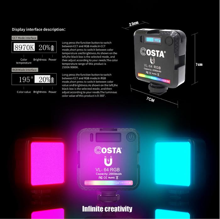 COSTA VL 64 RGB LED Video Light Magnetic Ambient Studio Video Foto Kuning Lampu Putih Baterai Usb
