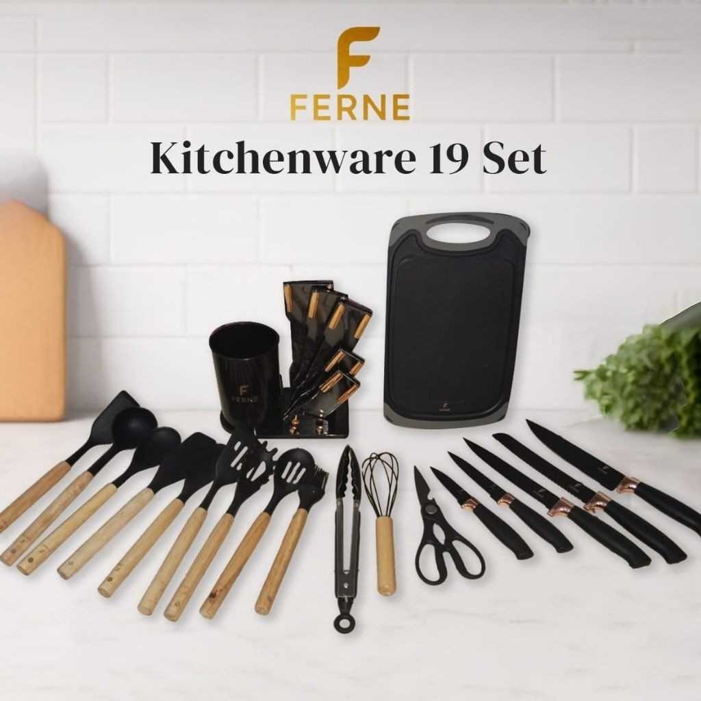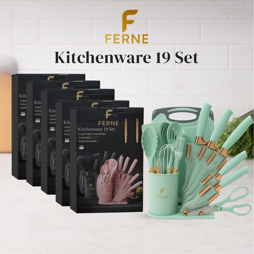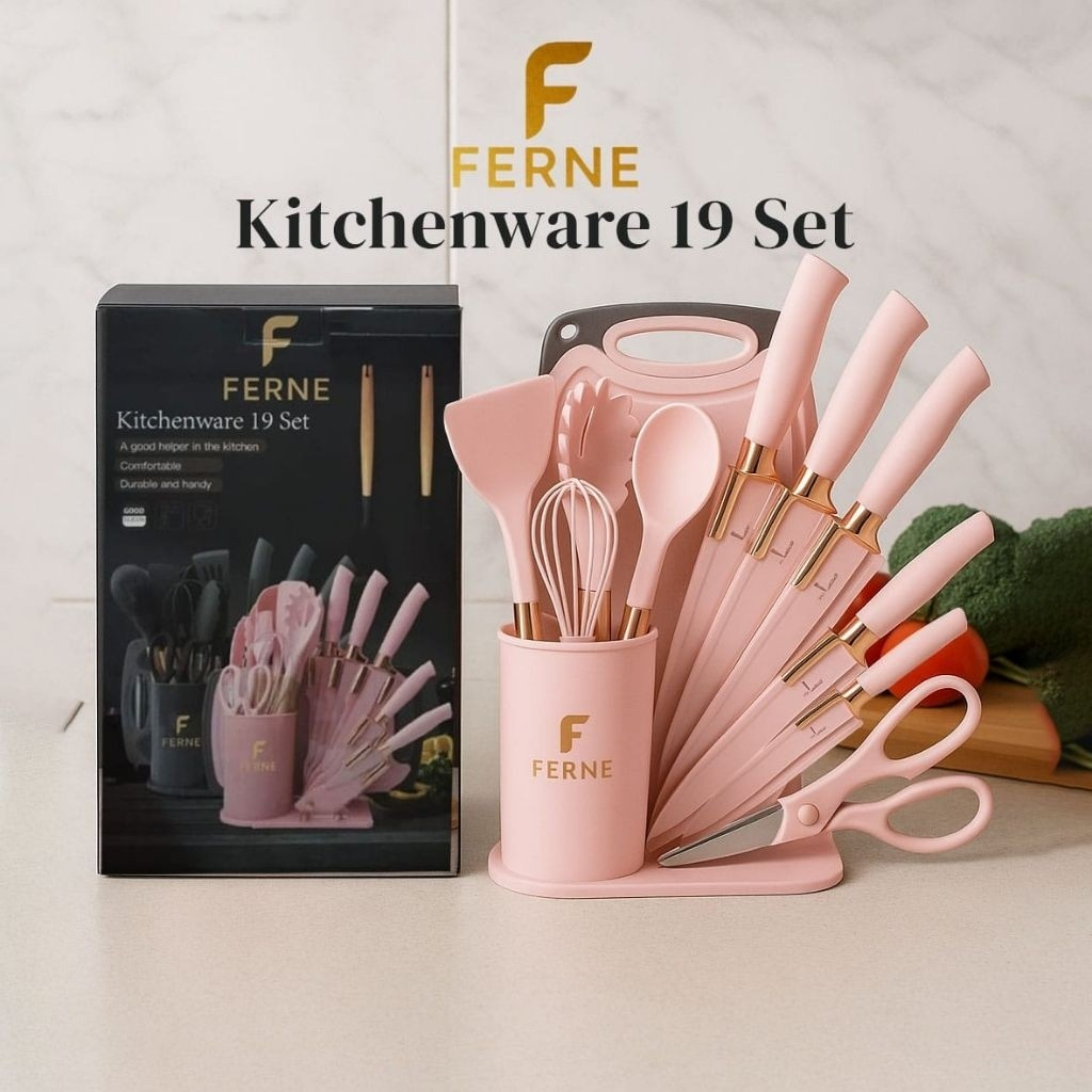 Ferne 19 Pcs Set Pisau & Peralatan Masak Silikon Lengkap dengan Rak – Spatula, Sendok, Cooking Tools Kitchenware & Knife