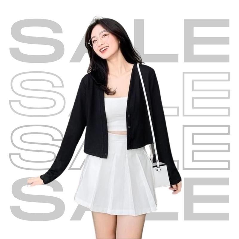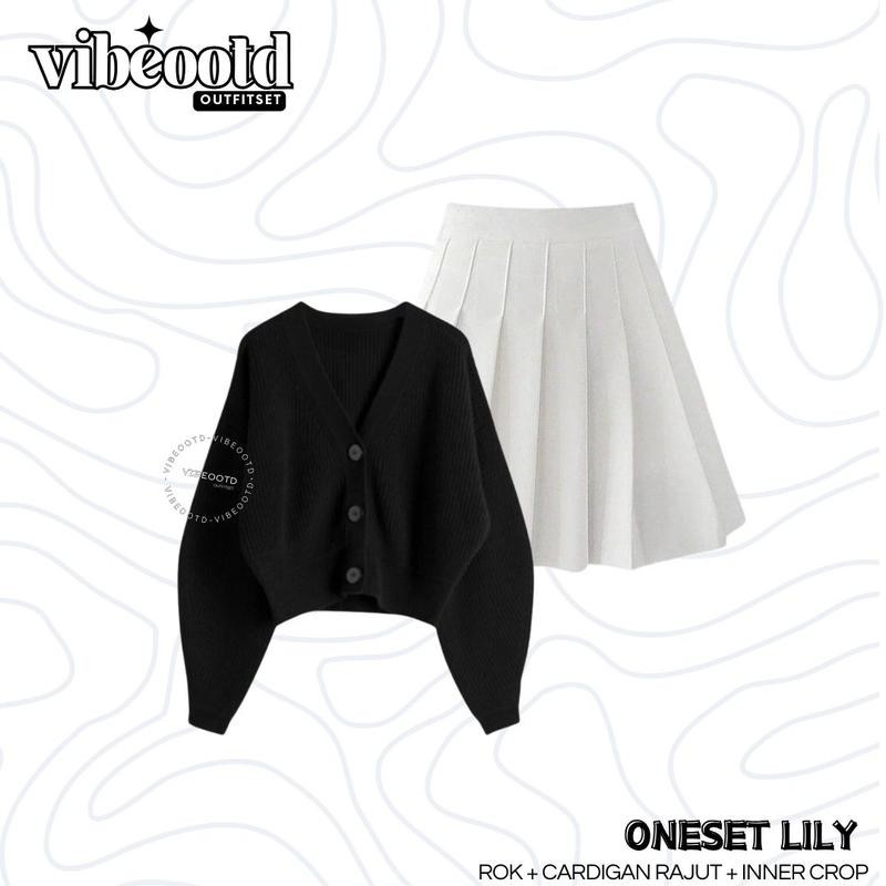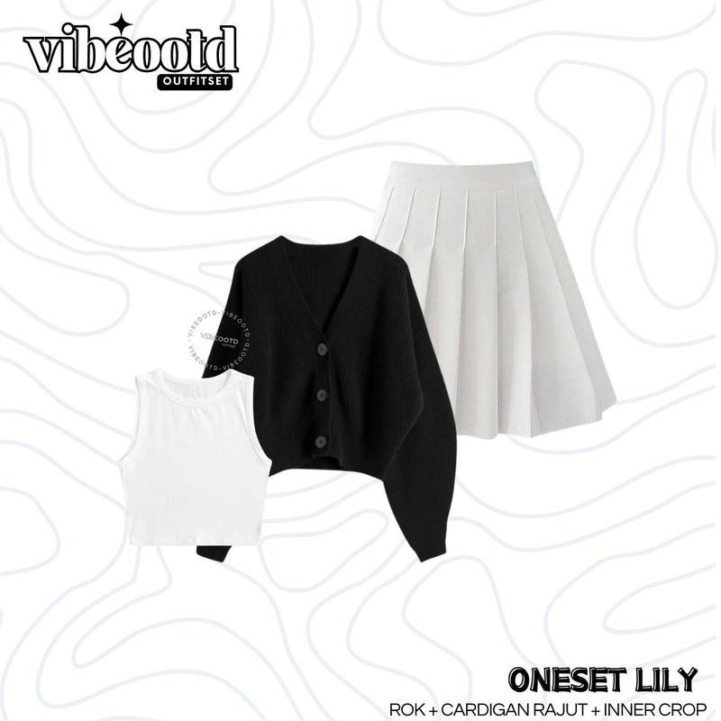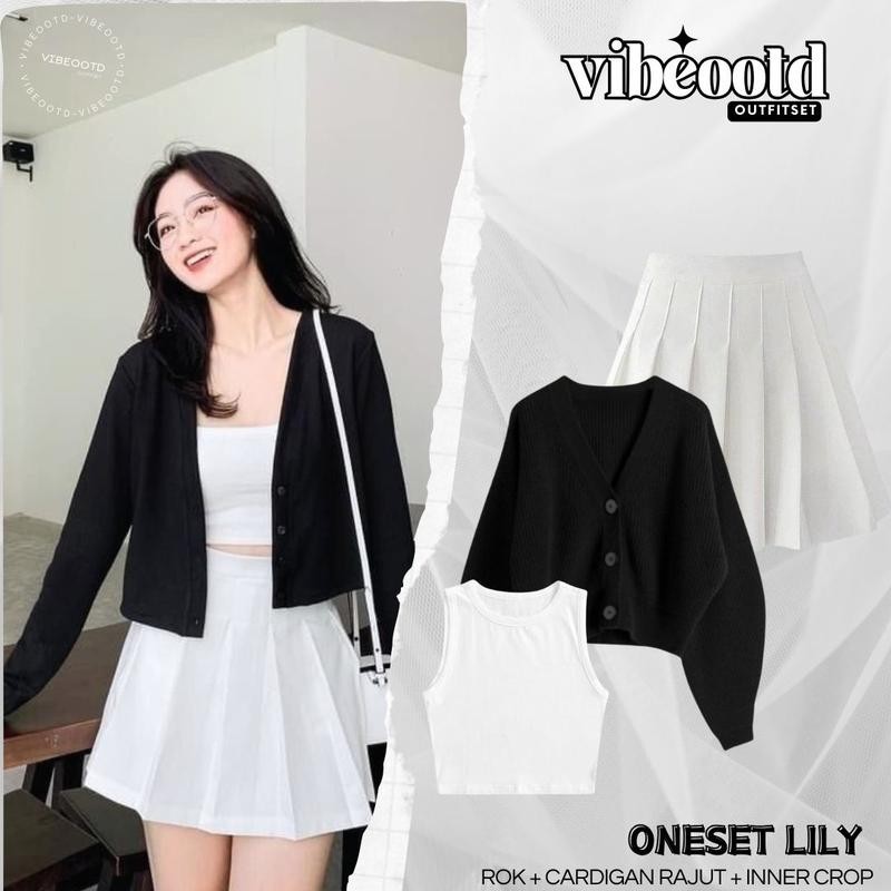 LILY OUTFIT SET WANITA ( BAWAHAN ROK MINI PENDEK + ATASAN OUTER CARDIGAN RAJUT PANJANG + INNER CROP ) ONESET KOREAN STYL