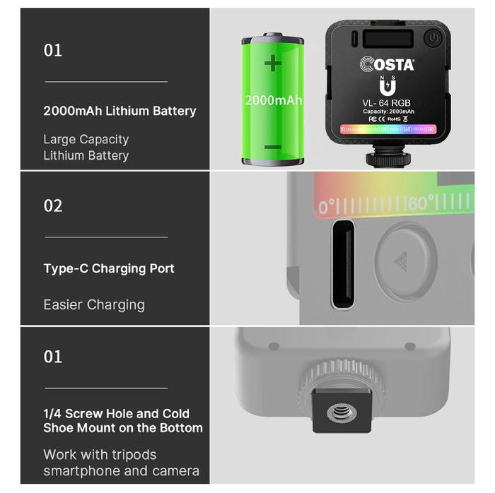 COSTA VL 64 RGB LED Video Light Magnetic Ambient Studio Video Foto Kuning Lampu Putih Baterai Usb