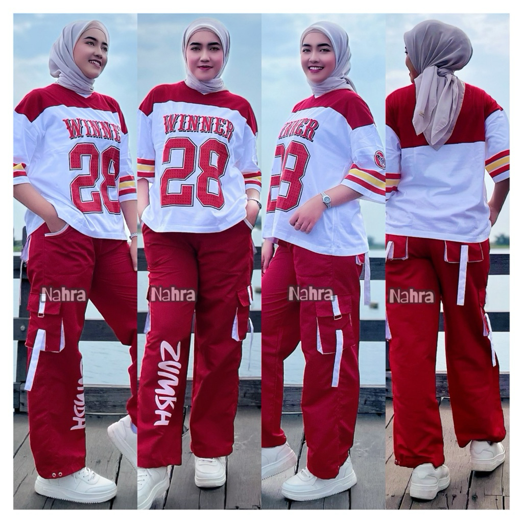 Setelan Kaos Winner 28 Unisex & Cargo Zumba 1SET Bahan Katun Combat 24s dan Celana Bahan Parasut Untuk Aktifitas Olahrag