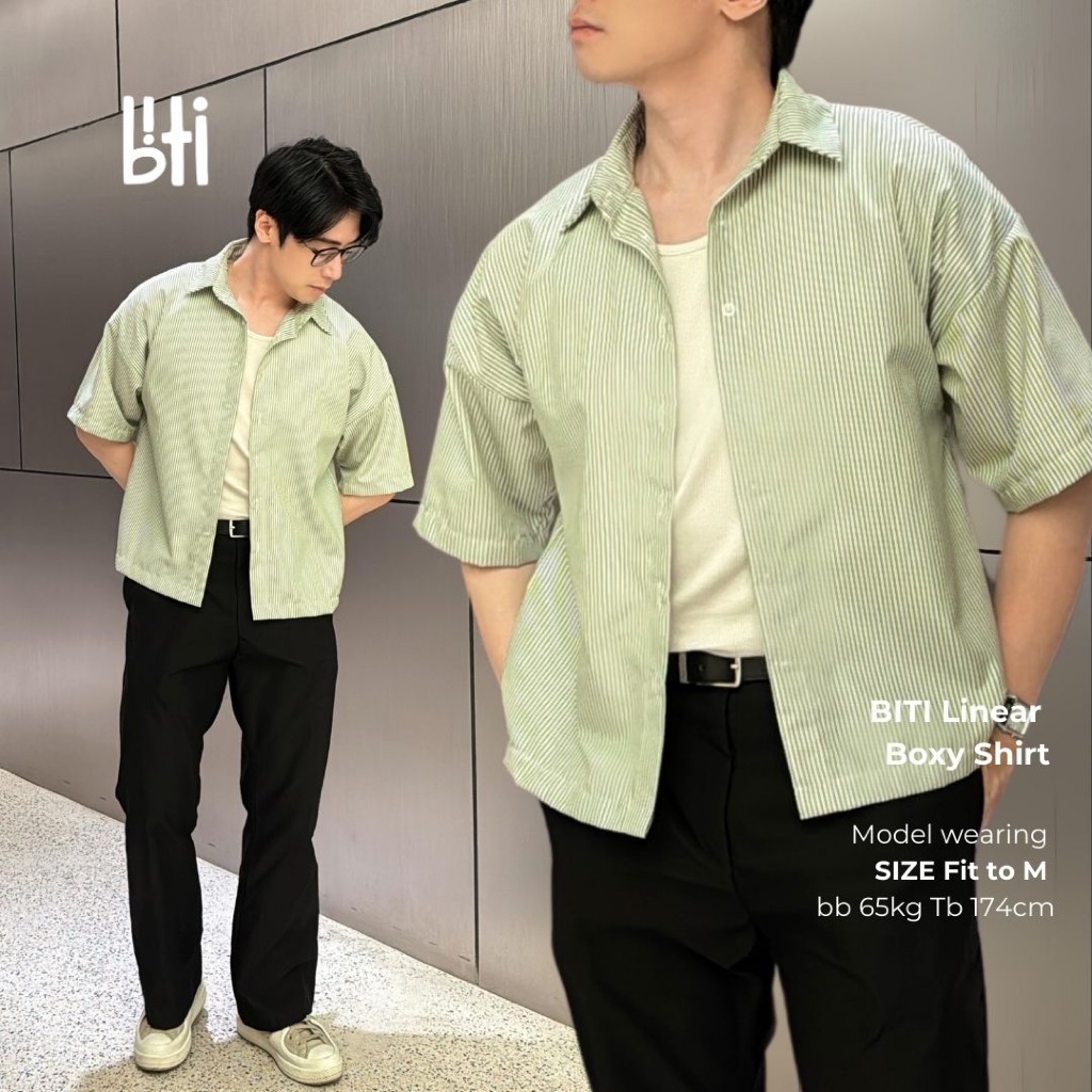 [Mall] BITI Linear Boxy Shirt | Kemeja Oversize Biru Garis Stripe lengan pendek Casual Pria