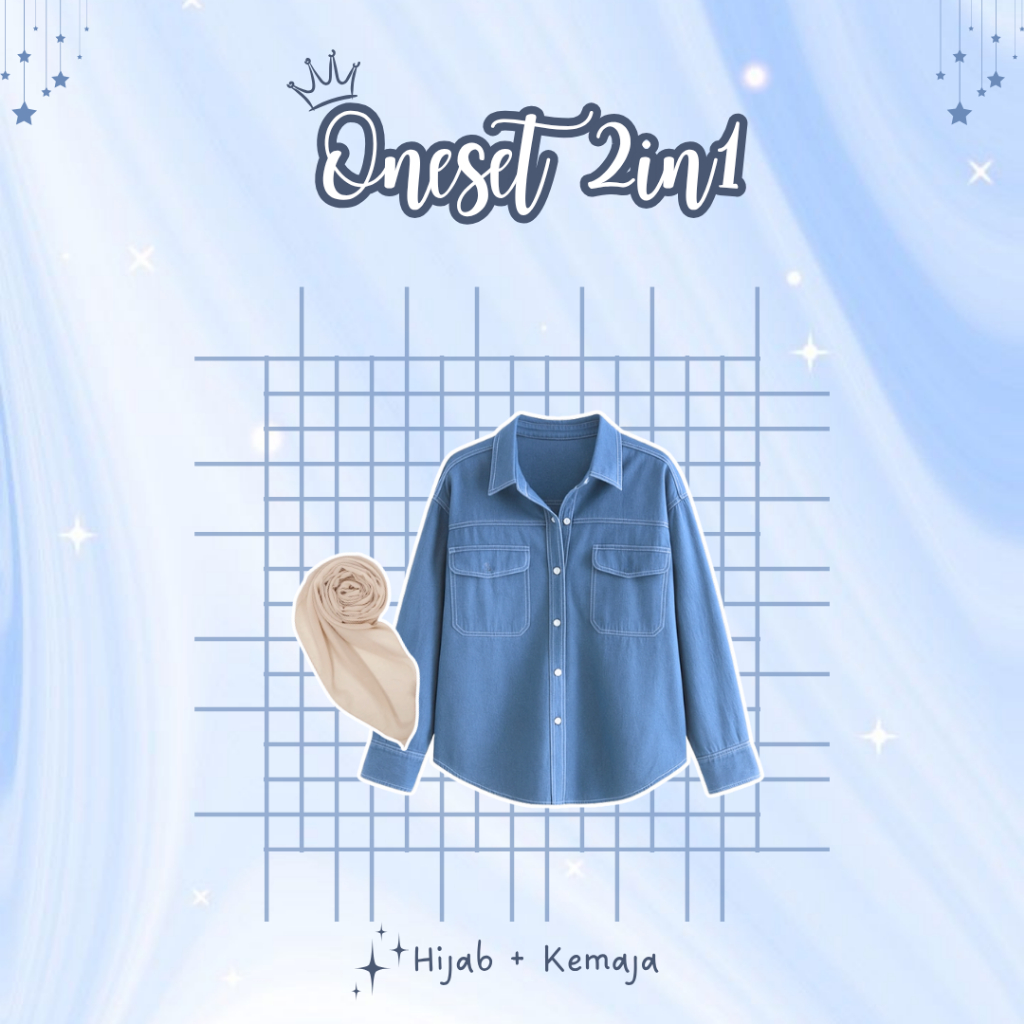 One Set Blue Denim Wanita Kekinian 3in1 ( Celana Cutbray, Kemeja, Inner Manser, Hijab ) Style Remaja ,BA8
