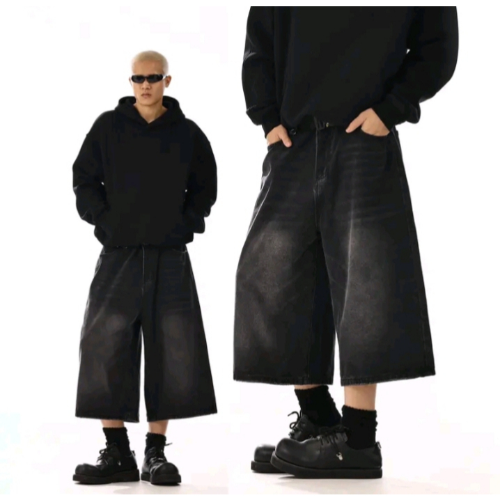 Celana Jorts Jeans Pria Wanita Model Baggy Whisker Skena Oversize Kekinian