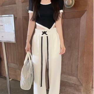 Laetus One Set T-shirt Lengan Pendek Crop Top Round Neck + Celana Panjang Wanita Drawstring Straight (S/M/L/XL) 1694 Kao