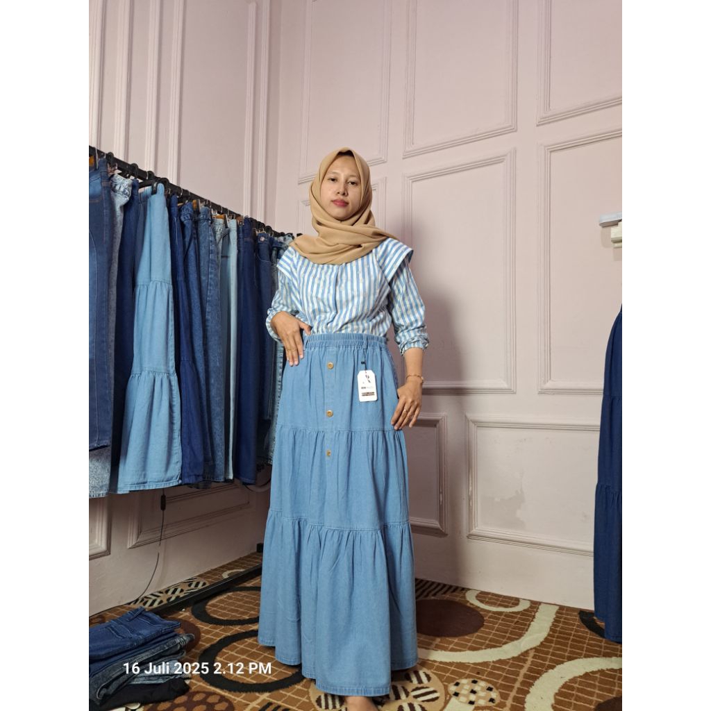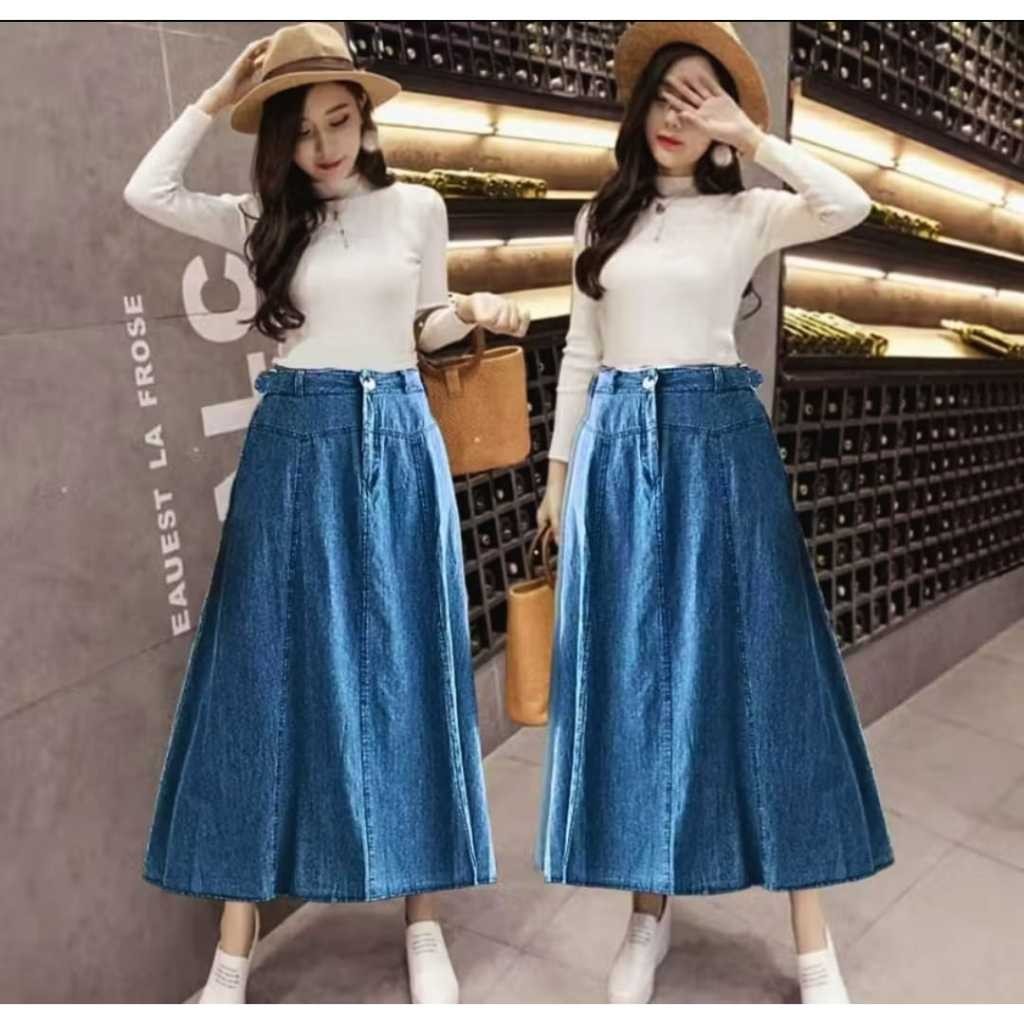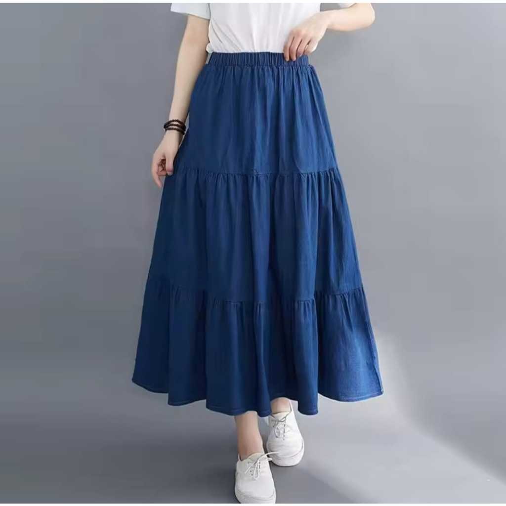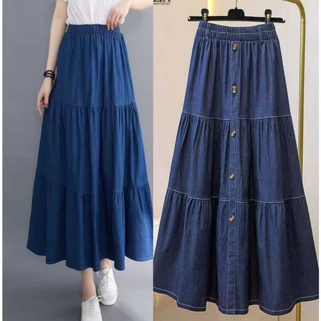 Ruffle Kancing A-Line Rok Jeans Skirt Wanita Panjang Tebal Nyaman