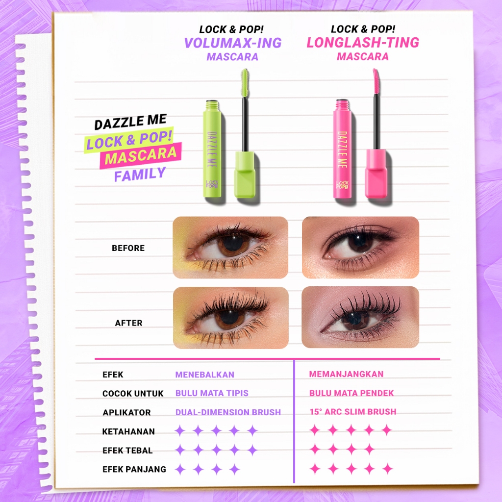 [NEW LAUNCH] DAZZLE ME Lock & Pop Duo Mascara Series VoluMAX-ing and LongLASH-ting Mascara Smudgeproof Transferproof Waterproof Maskara Longlasting Tahan Lama 24 Jam Hasil Akhir Lentik
