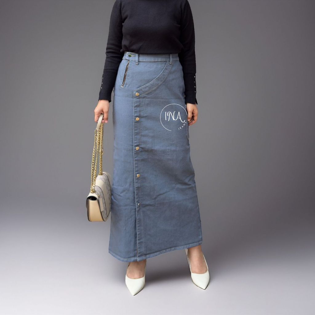 Leta Button Skirt - Rok Jeans Panjang Wanita Stretch Pinggang Karet Semi A Line
