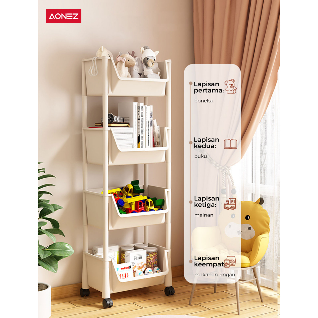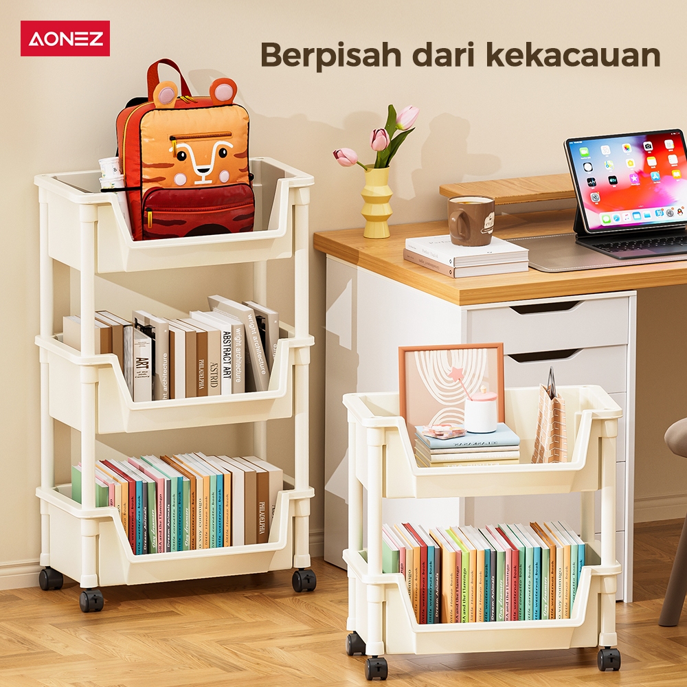 AONEZ Susun Serbaguna Tempat Rak Buku Anak Lemari Buku Plastik Rak Portable Roda Rak Mainan Rak Roda Toy Storage Rak Susun Tempat