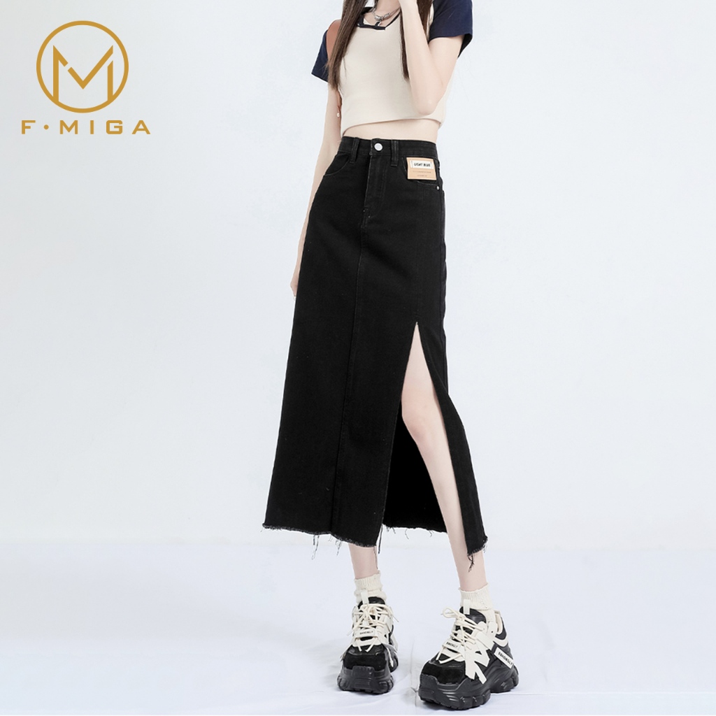 F·MIGA C122 Korean High Waist A-Line 3/4 Denim Rok Jeans Midi Wanita - Hitam
