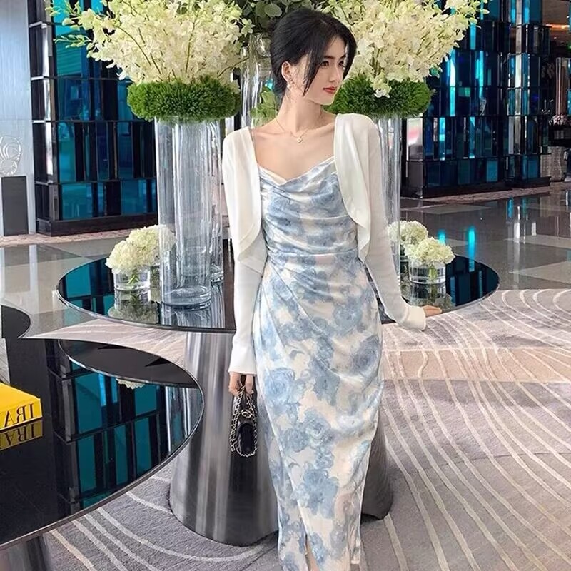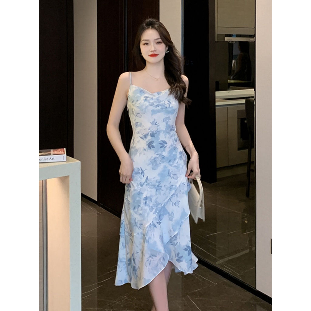 EMITA BLOOM Blue Floral Dress Biru Muda Summer Elegant Long Dress Pantai Wanita Korea Party import baju dress body press korean style terbaru 2025 kekinian XS-4XL