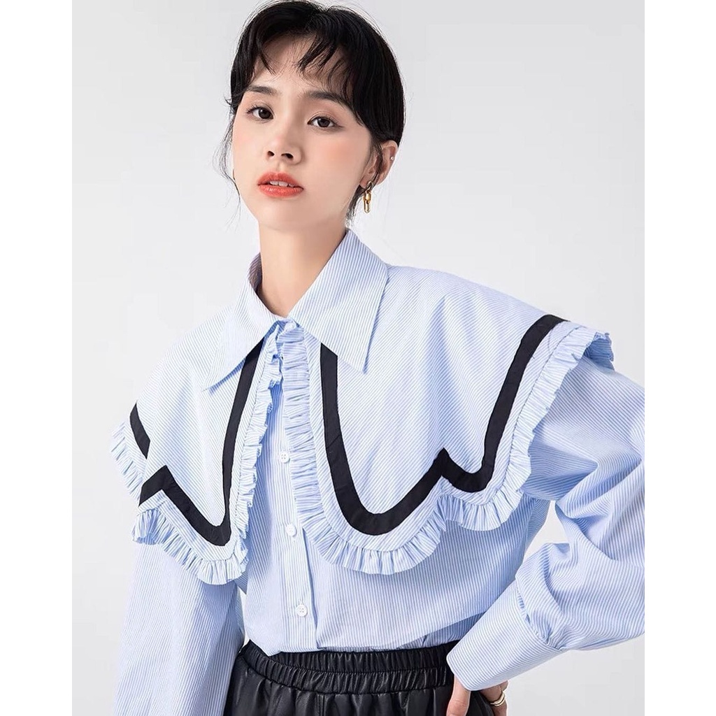 Vallina Outfit - Cameron Top Blouse Bertha Collar Atasan Shirt Kemeja Stripe Salur Cotton Korean Remaja Wanita Premium