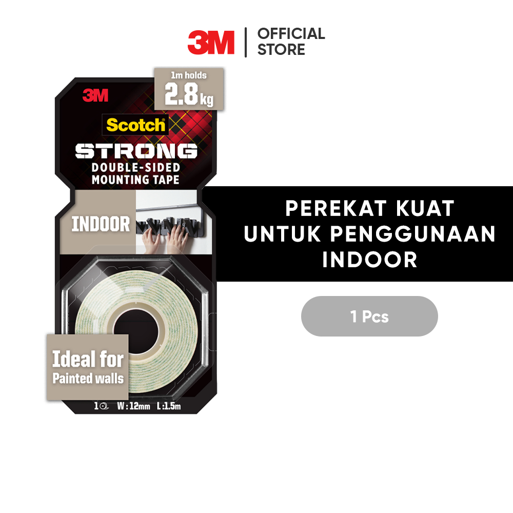 3M™ Scotch® Double Sided-Mounting Tape, Strong, 1M menahan hingga 2.8kg, 1 pc, 12 mm x 1.5 m, Untuk pengunaan dinding dalam ruangan