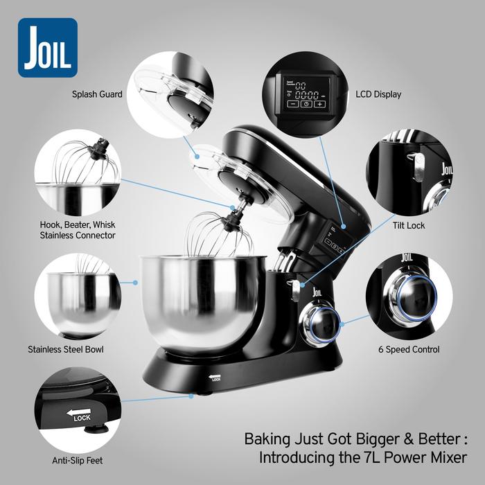 Joil Stand Mixer 7 Liter dengan Timer Off 6 Speed Mangkuk Stainless Steel Lengkap dengan 3 Alat