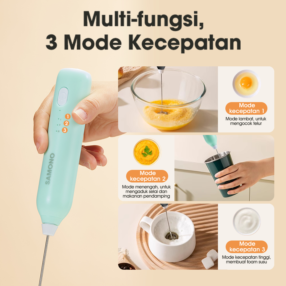 SAMONO Hand Mixer Mini 2in1 Elektrik USB Milk Frother – Pengocok Telur Pembuih Susu Pengaduk Kopi Cokelat 3 Kecepatan Po