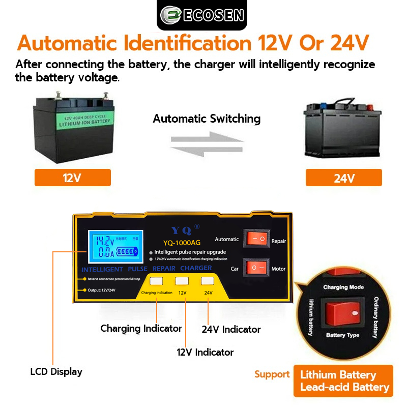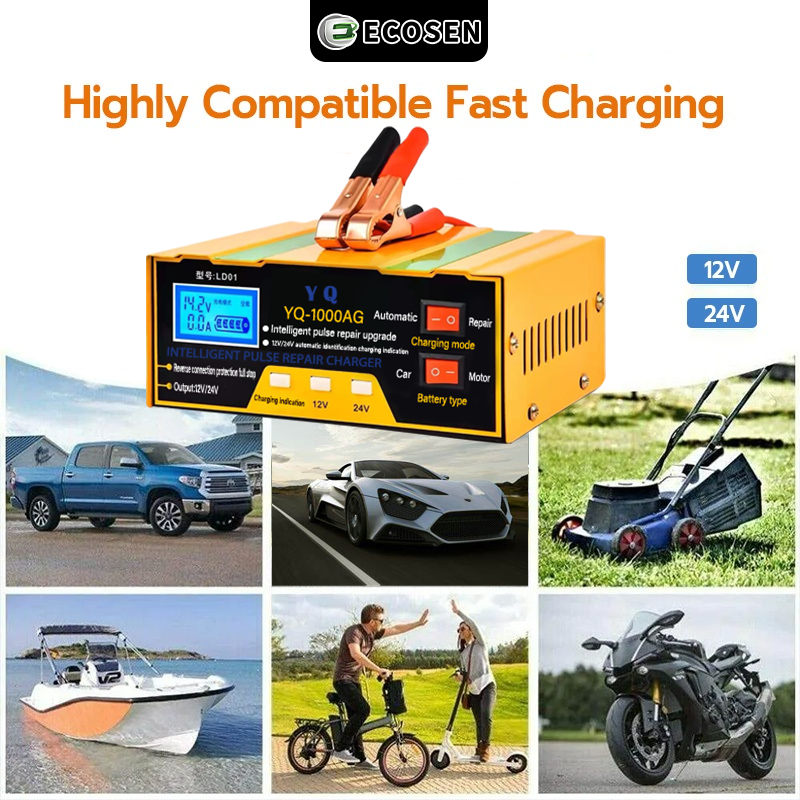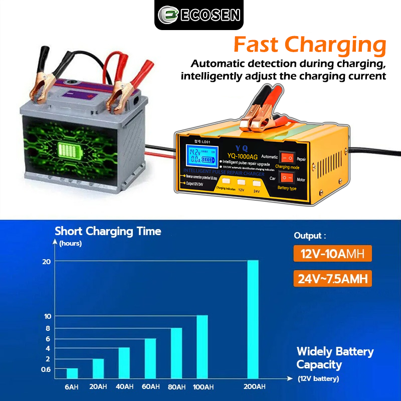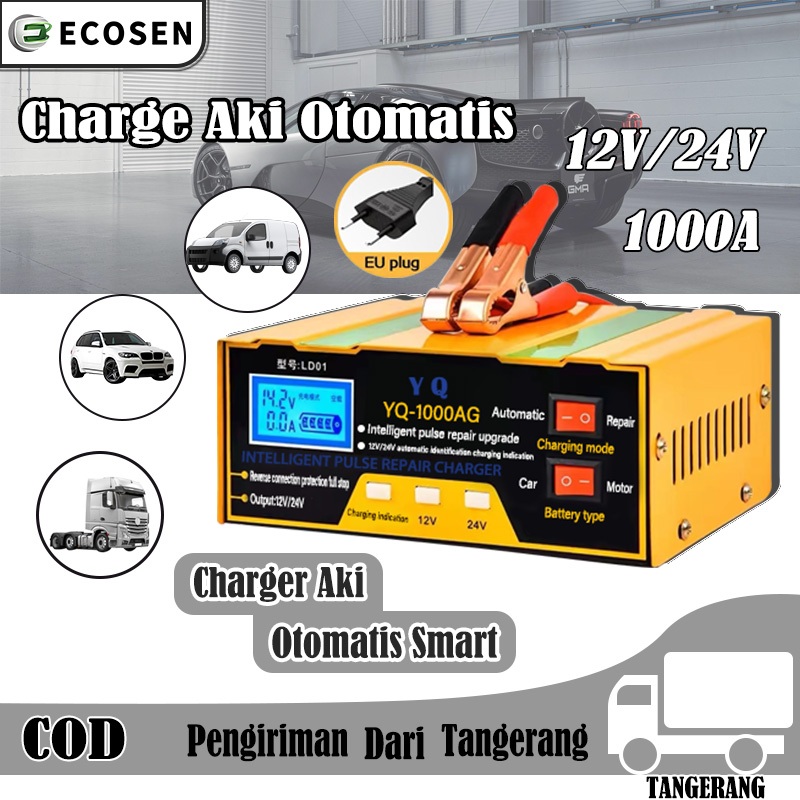 ECOSEN Charger Aki 12V/24V 6-105AH Smart Battery Charger Mobil Motor/Case Aki Mobil/Case Aki Motor/Cas Aki/Case Aki Motor Dan Mobil