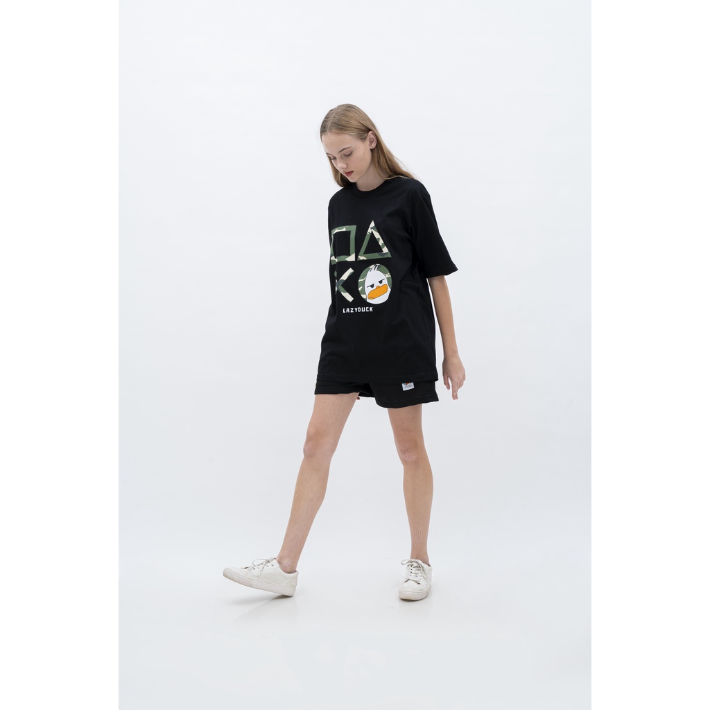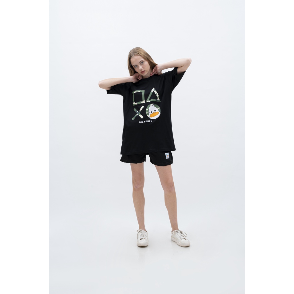 Bundling T-Shirt Dan Celana Pendek Unisex Merek Lazy Duck Tema Play Game Set Baju Casual Black Lengan Pendek M L Xl