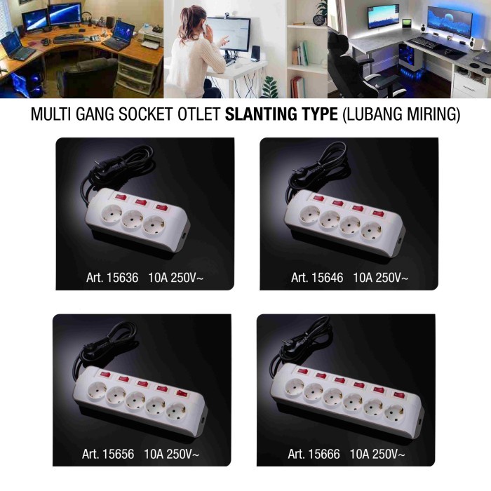 BROCO 15666 Stop Kontak Arde 6 Lubang Slanting + Kabel 1.5Meter + Saklar Individual