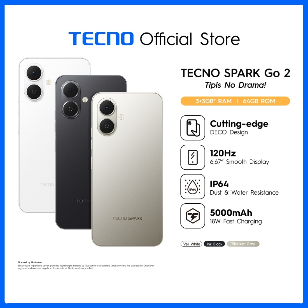 TECNO SPARK Go 2 3GB+3GB*/64GB, IP64, 6.67" HD+, 120Hz Smooth Display, 5000mAh, 18W Charging, Freelink Communication,
