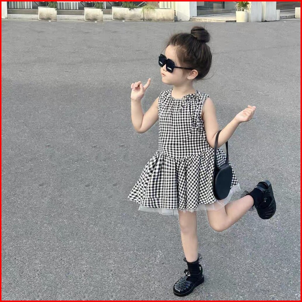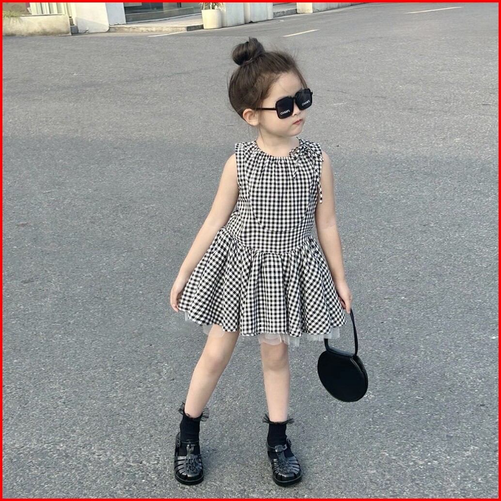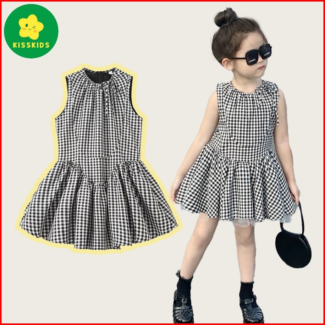 Kisskids Ins Gaun Anak Perempuan Dress Rompi Bergaris Hitam Rok Gaun Berjumbai Tanpa Lengan Stripe Lace Dress Baju Impor