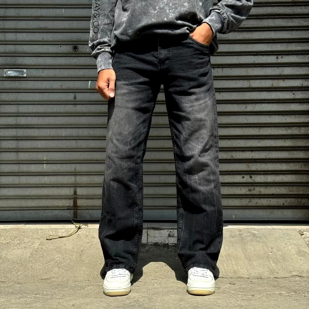 Terlaris..Celana Jeans Pria Black Wisker Loose fit Reguler Gombrong Standard Denim Washed Wide Leg Skena