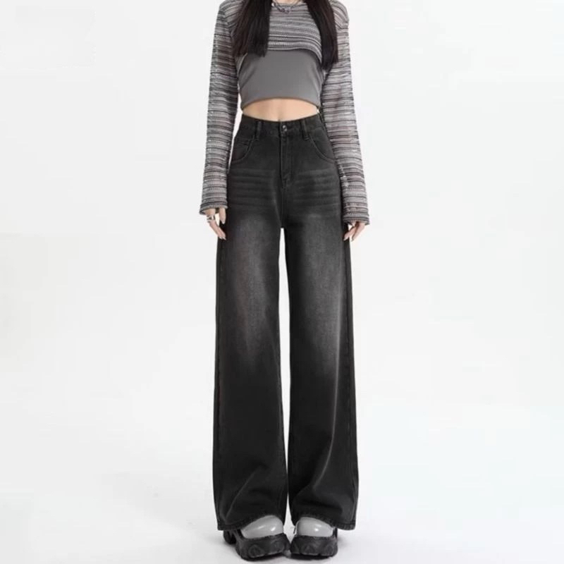 Celana Hitam Retro Highwaist Celana Jeans Wanita Loose Kekinian
