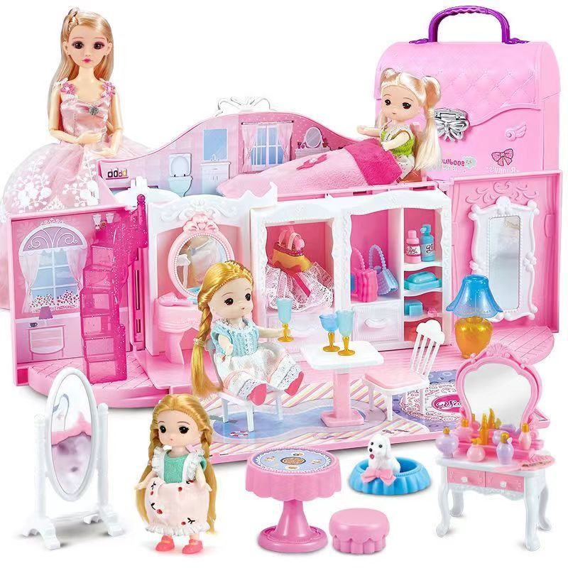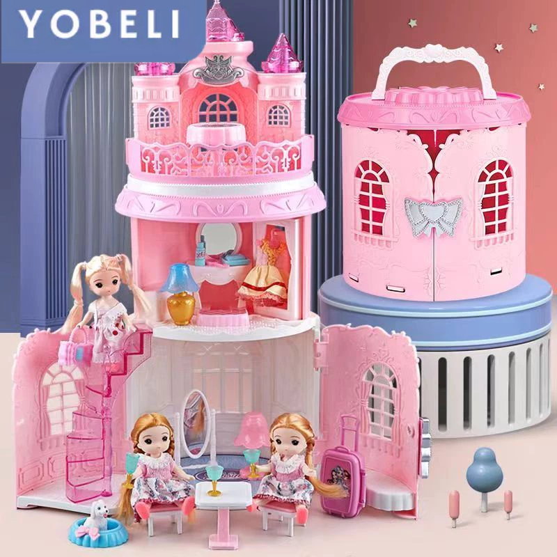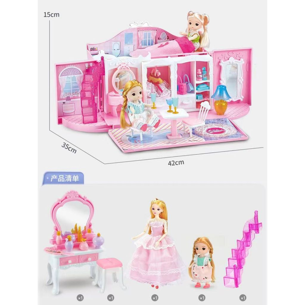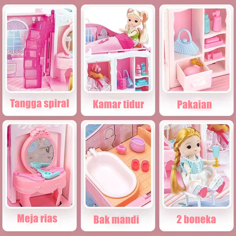 Mainan Rumah Boneka Perempuan Tas Koper Princess Pink Kastil dengan Lampu