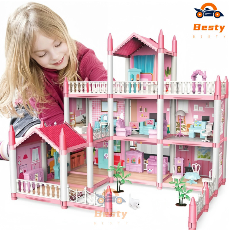 Besty DIY Bermain Rumah Vila Putri 3D Mainan Kastil Rumah Boneka Gratis Strip Lampu Dan Boneka Kain