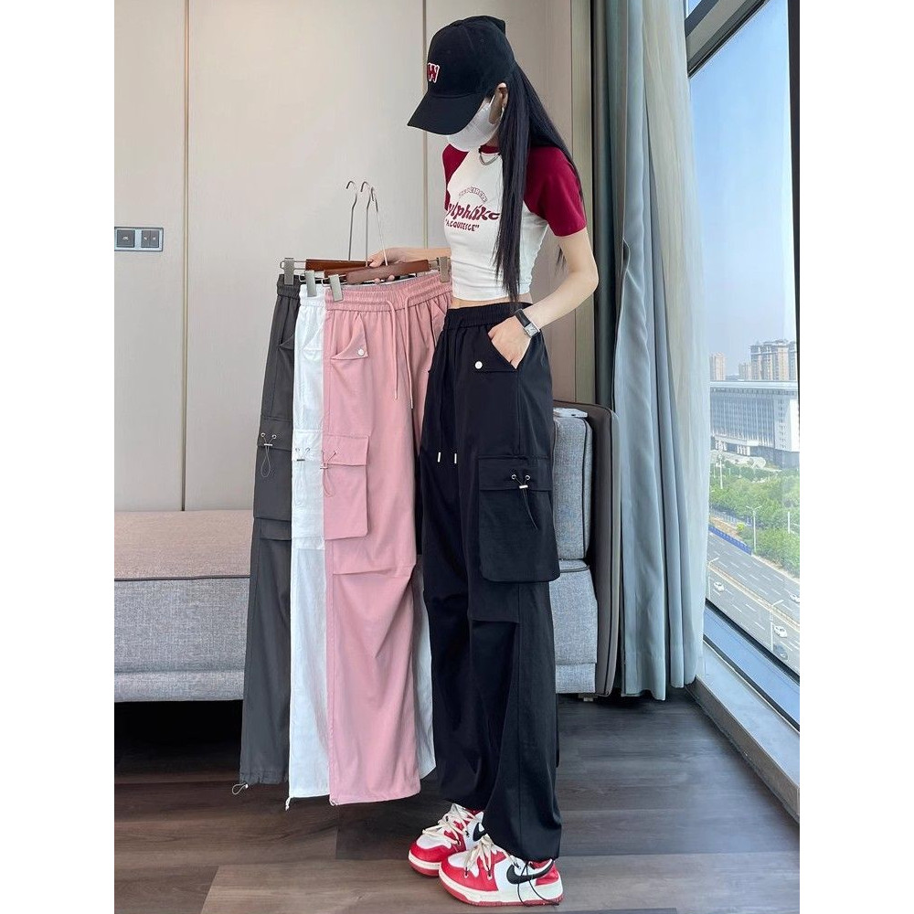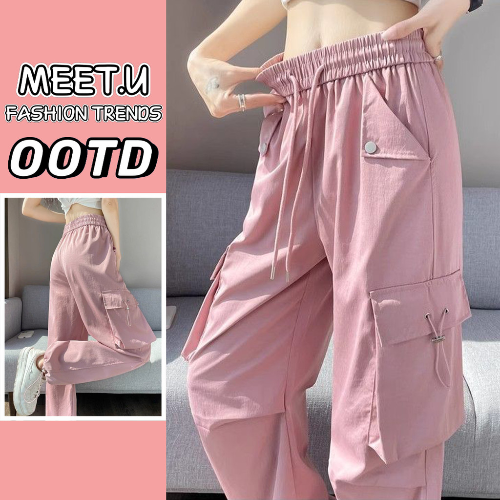 MEET.U S-4XL Celana Wide Leg Wanita Celana Kargo Pinggang Karet Kasual Wanita High Waist Cargo Pants