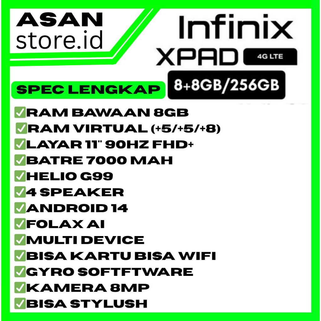 INFINIX XPAD 8/256 - Total Ram 16 GB (8+8) - 4G LTE Kartu SIM - Mediatek Helio G99 - Layar 11" - 7250 mAh - Folax voice assistant - Kartu & Wifi - Garansi 1 tahun