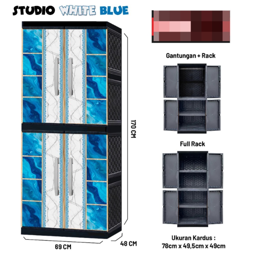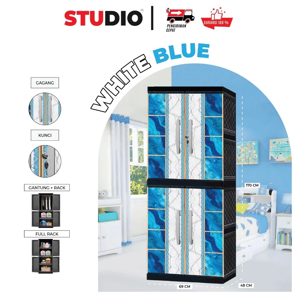 Lemari - rak baju - rak susun - Lemari Pakaian Plastik Jumbo 2 Pintu Gantung + Full Rak + Kaca / Tanpa Kaca WHITE BLUE