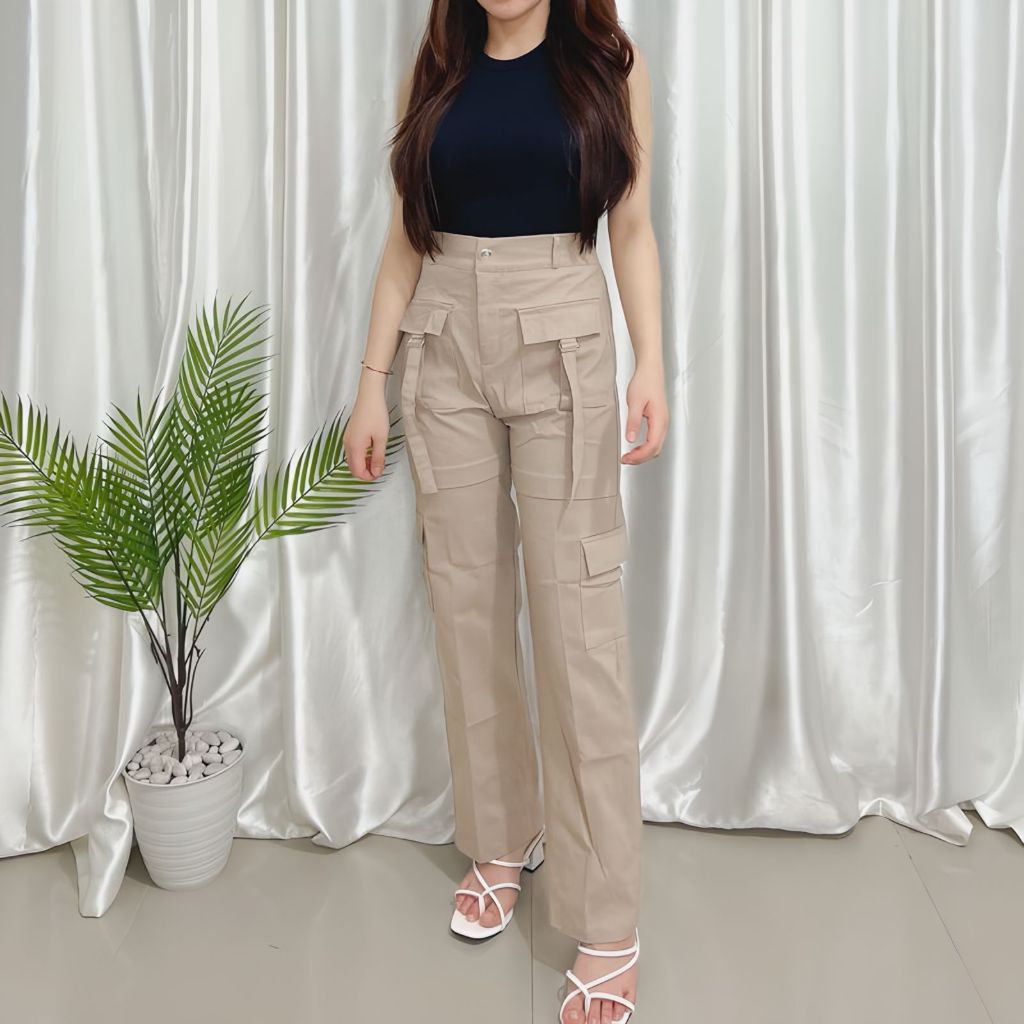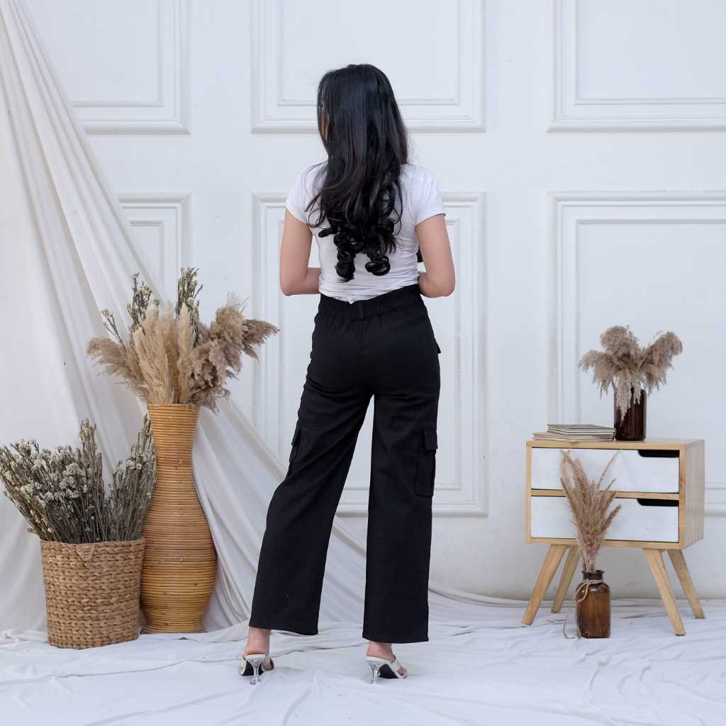 Olivia Celana Cargo Wanita - Celana Panjang Cargo Strech Katun Twill Kulot Wanita Highwaist