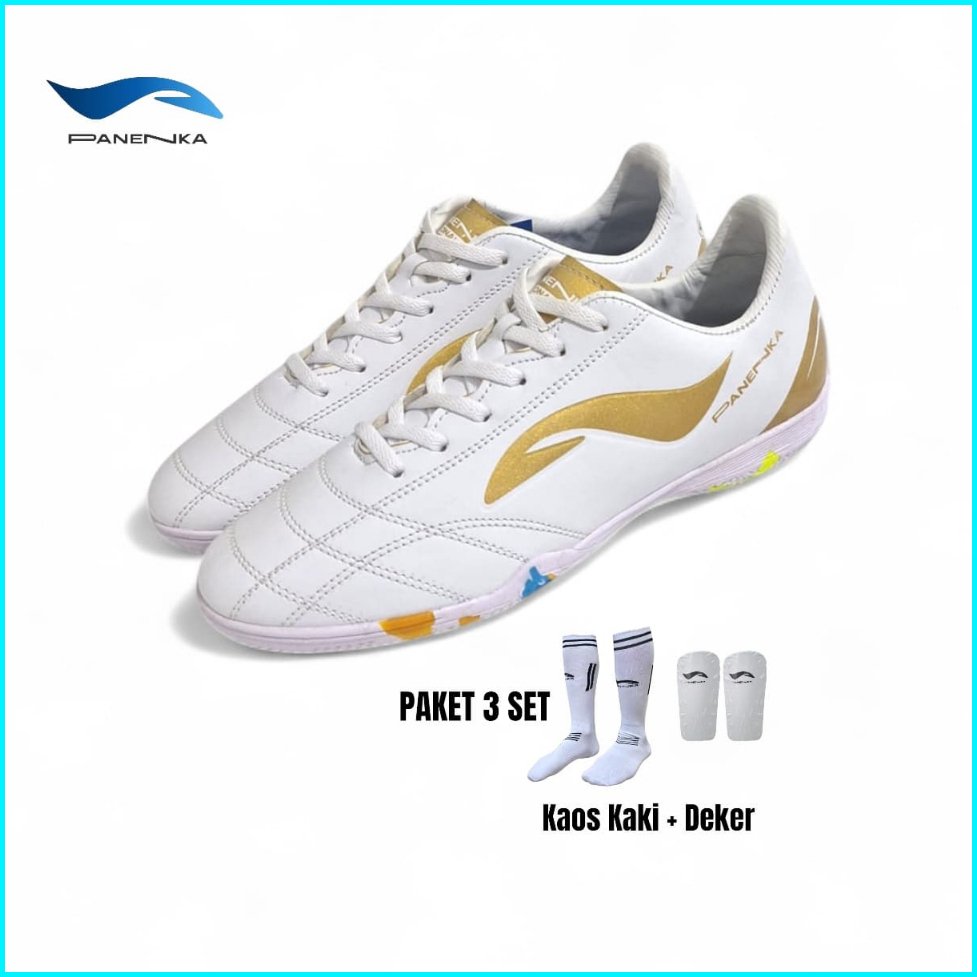 Panenka - Paket Komplit Sepatu Futsal Panenka Revolt White Free Kaos Kaki Skin Deker Stringbag