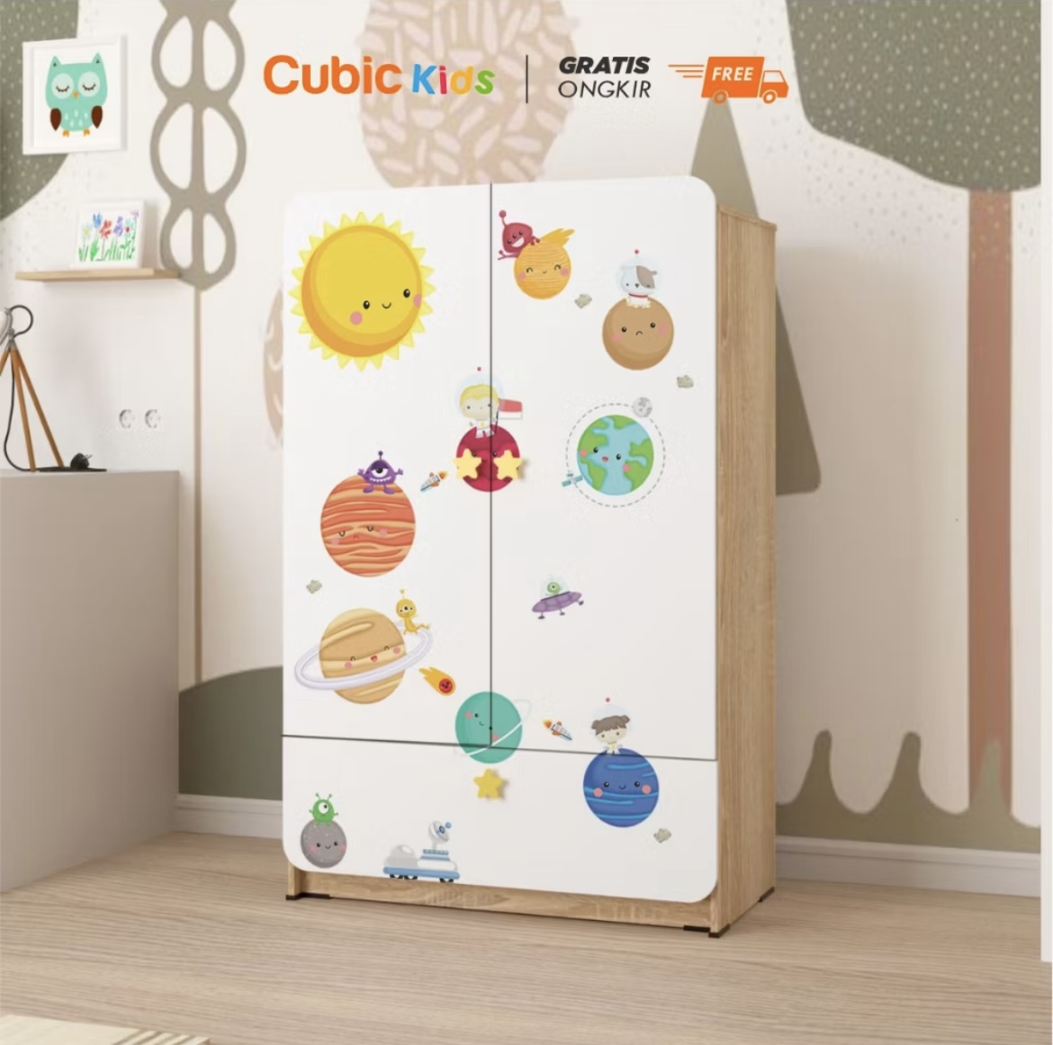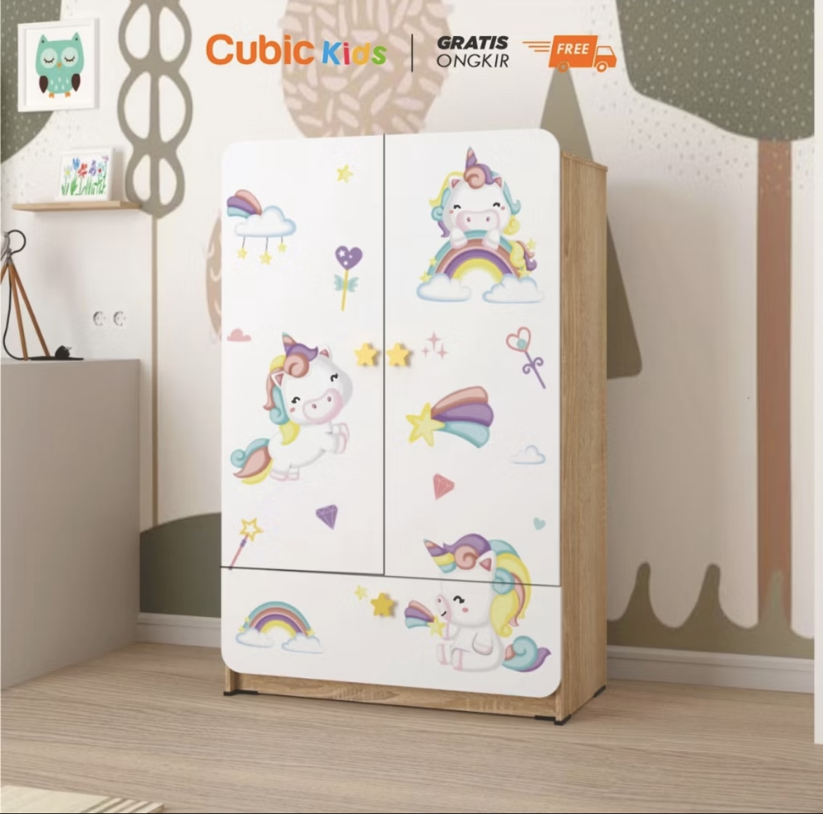 Lemari Pakaian Anak Bergambar Karakter Kayu Minimalis Modern Rak Pakaian Gantung Sliding 3 Susun Cubic Kids Poco BL 120