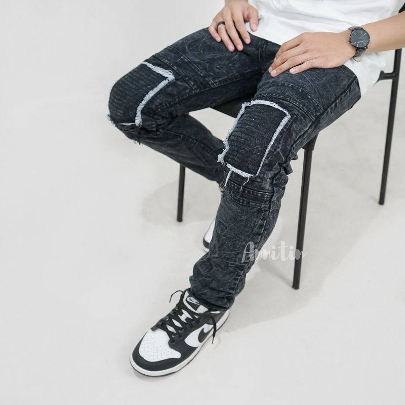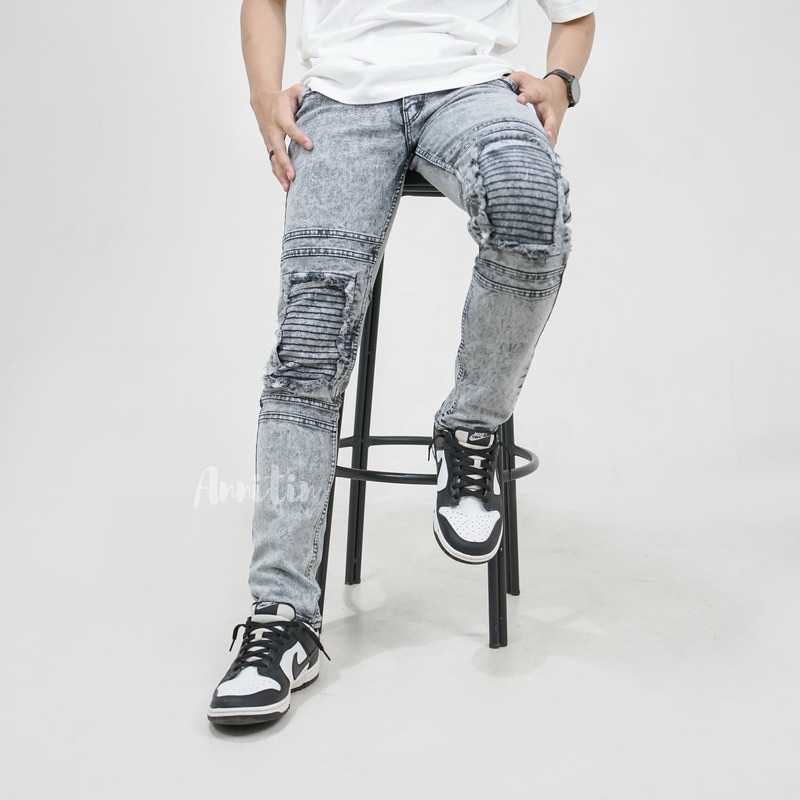 Celana Bikers Riders Polos Panjang Snow Black Jeans Biker Sobek Skinny Slim fit - Celana Jeans Pria-Celana Panjang Pria-Denim Terbaru Robek Lutut