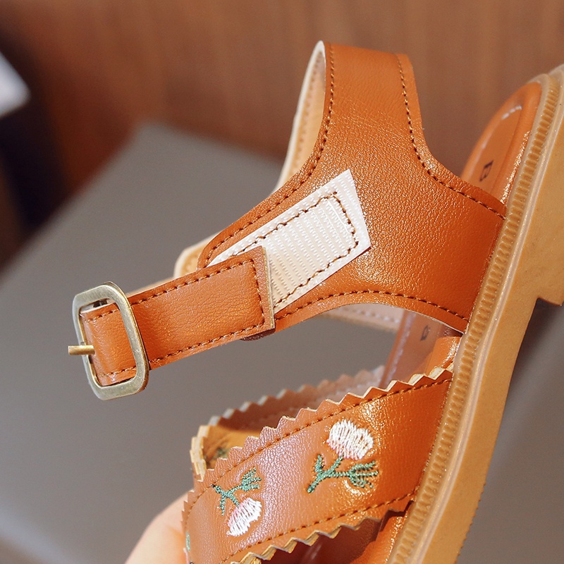 Sandal Anak Perempuan Tali Silang Ruffle Bunga Bordir Sol Lembut