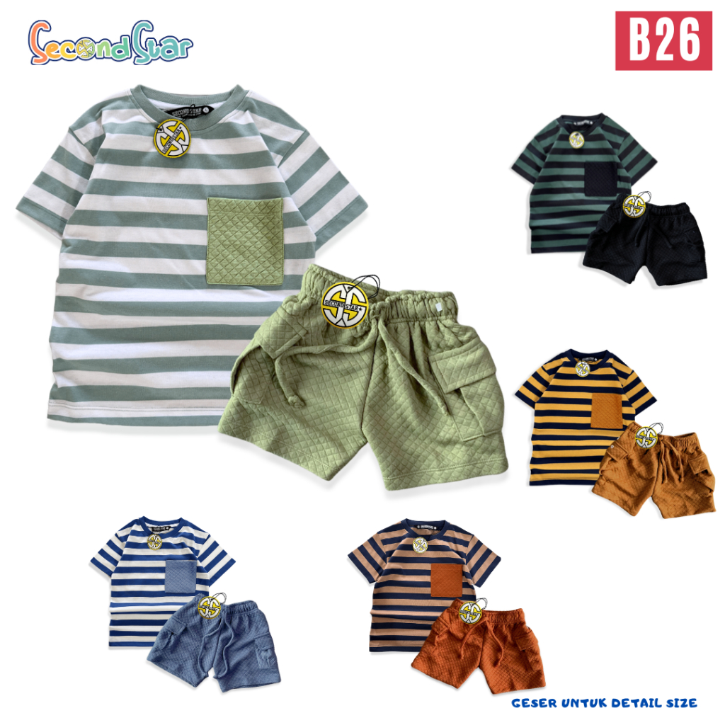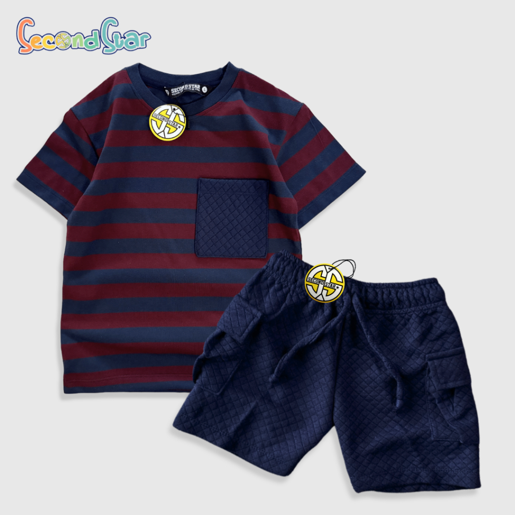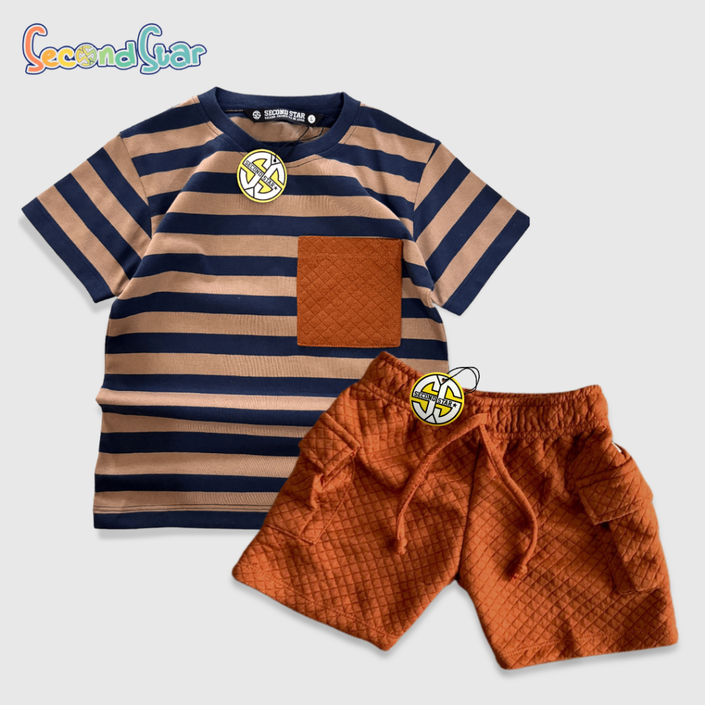Setelan Anak Secondstar Kaos Salur Celana Cargo Cvc Diamond Knit Unisex