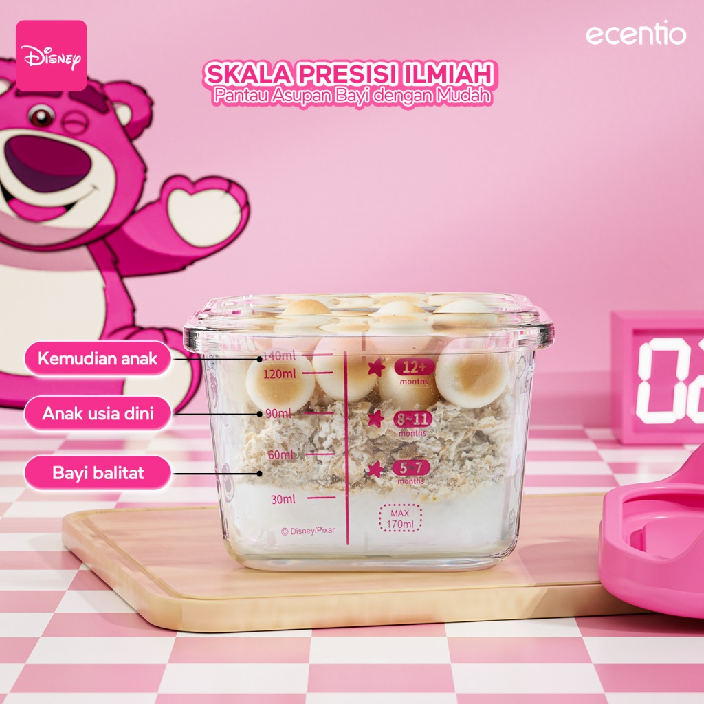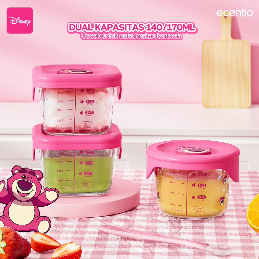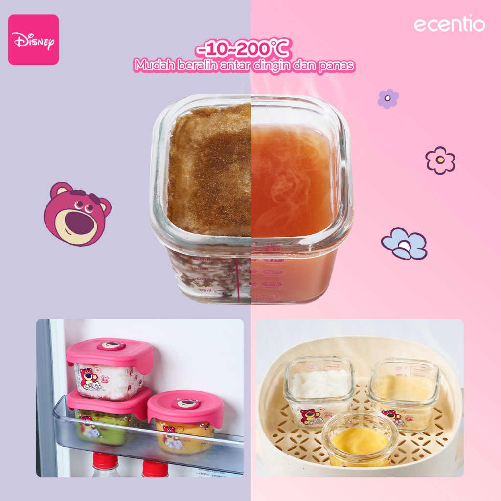 Food Container Bayi Ecentio Kaca Disney Lotso 3pcs Set Dengan Sendok Silikon