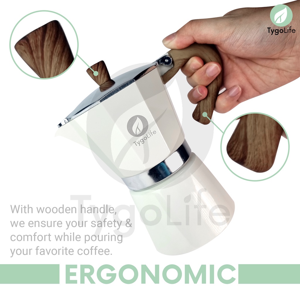 TYGO VOLCANO MOKA POT 6 CUP COFFEE ESPRESSO MAKER 300ML ALUMINIUM KAYU